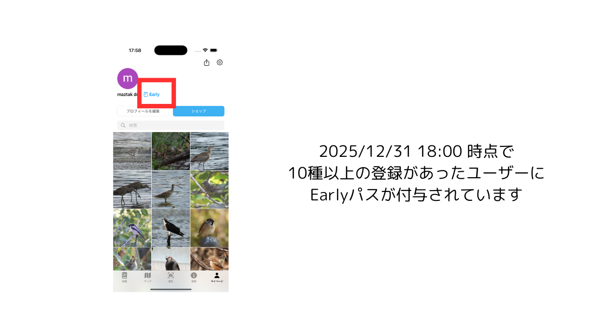 トライアルより上のビギナー・ミドル・プロレベルへの挑戦は前のレベルのコンプリートが条件ではなく、一旦はベーシックプラン以上の加入ユーザー様が挑戦可能としています。ただし本日時点で10種以上を野鳥GOに登録されていたユーザー様は早期ユーザー特典ということで Early パスを付与しており、対象の方は全レベルに切り替えが可能です。(マイページで確認できます)