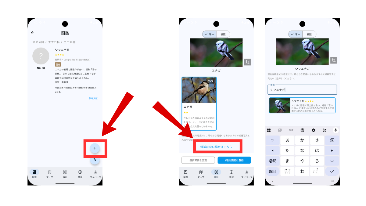 なお識別AIは亜種対応していないため、図鑑ページの「+」ボタンから直接追加いただくか、識別結果の「候補にない場合はこちら」リンクから対象の亜種名で検索してご登録ください。